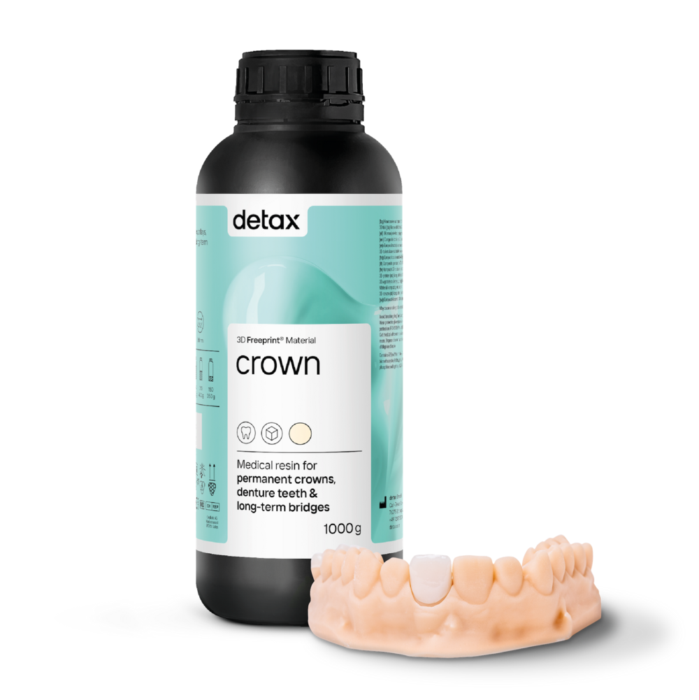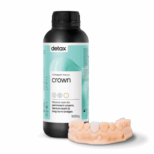 Die Detax Crown ist eine 3D-Druckflüssigkeit zur Herstellung von permanenten Kronen, prothetischen Elementen und langlebigen provisorischen Brücken. Die Formulierung der Detax Crown Flüssigkeit wurde für 3D-Drucker wie Asiga Max und Pro4K-Drucker und andere 3D-Drucker mit einer Wellenlänge von 385nm entwickelt.