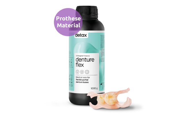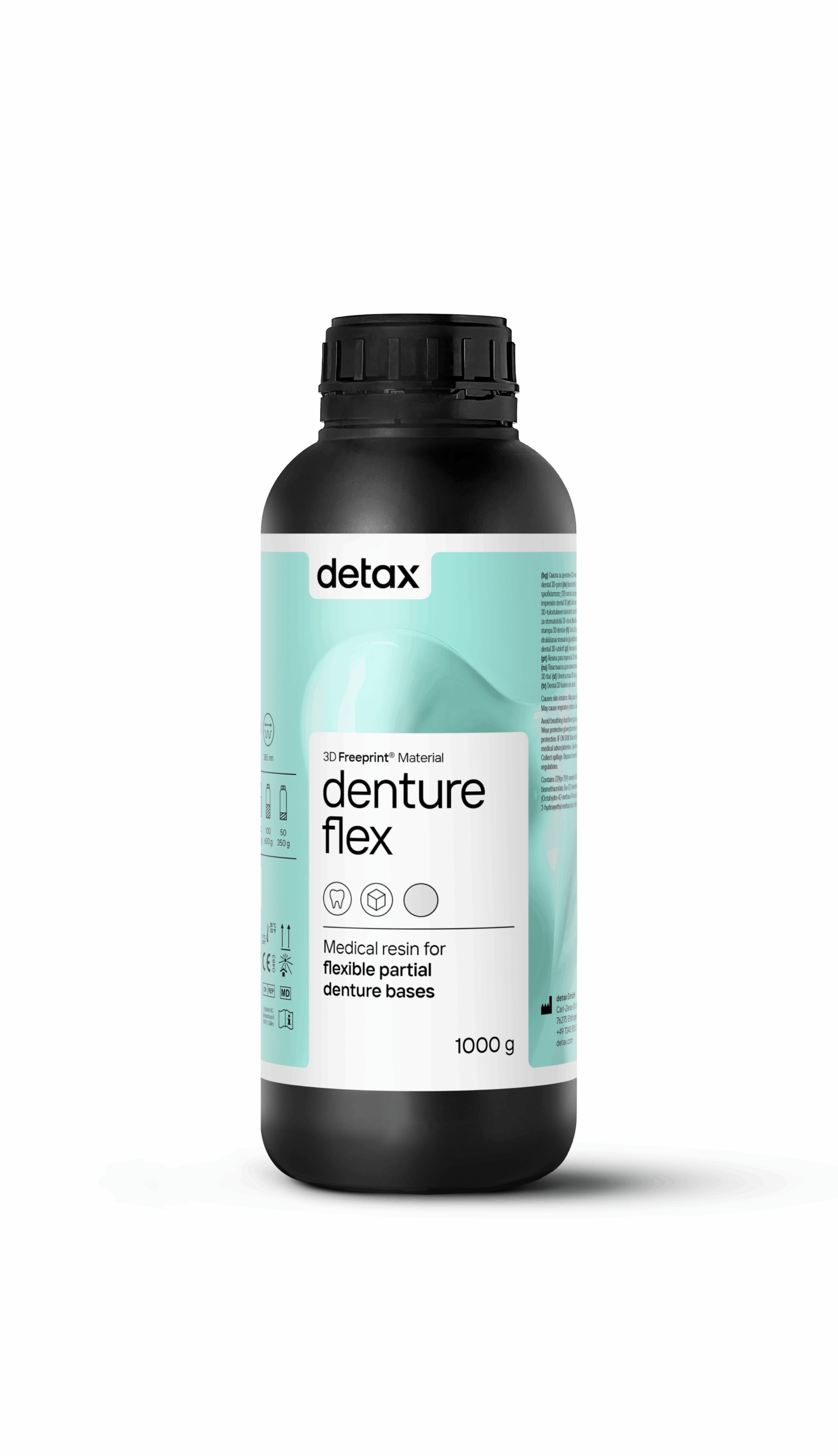 Das Detax Freeprint Denture Flex 3D-Druckharz bietet unübertroffenen Tragekomfort dank der Präzision der 3D-Drucktechnologie und dem Verzicht auf Metallklammern. Dies sorgt für eine perfekte Passform und maximalen Komfort für den Patienten. Das Material ist in zwei Farbtönen erhältlich, die ein natürliches Aussehen garantieren, während die transparente Version die ursprüngliche Zahnfleischfarbe perfekt bewahrt und so ein ästhetisches Ergebnis ermöglicht.