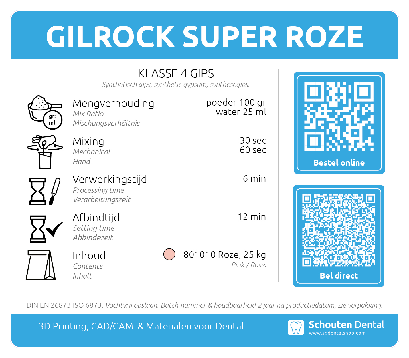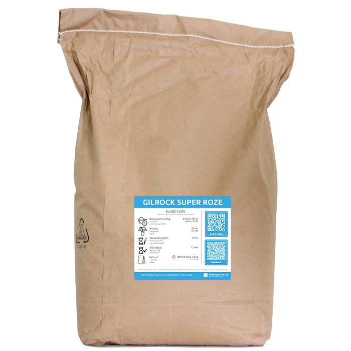 Een kwalitatieve synthetische klasse 4 stonegips wat uitermate geschikt is voor definitieve modellen, tegenbeetmodellen en werkmodellen voor prothesen. De Semirock is uitsluitend verkrijgbaar in de kleur roze. De hoge kwaliteit van deze gips staat garant voor een perfect werkstuk. De verwerkingstijd van de Semirock is 5 minuten met een afbindtijd van 10 minuten. Semirock Roze is bij Schouten verkrijgbaar in verpakkingen van 25 kg.