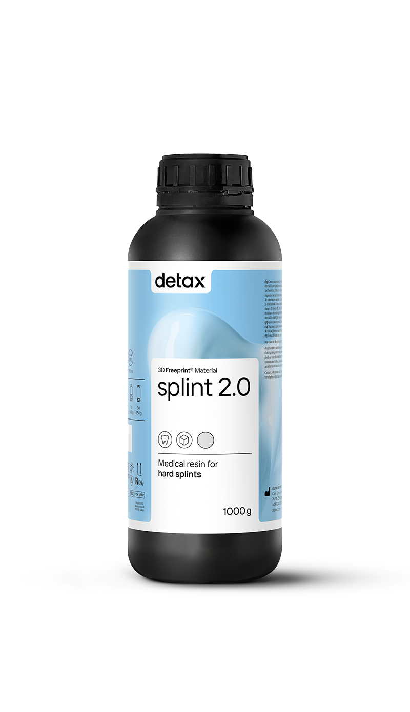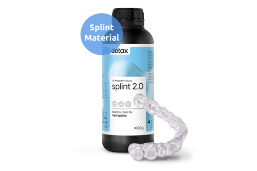 Für die generative Herstellung von Dentalformen fürBohrschablonen für die Implantologie, Röntgenschablonen und Aufbiss-Schienen ist Detax Freeprint Splint ein transparentes 3D-Kunststoffharz. Es eignet sich für alle LED / UV-Drucker mit einem Lichtspektrum von 405 nm oder mit einem Lichtspektrum von 378-388 nm. Klare transparente Formulierung für visuelle Inspektion im Arbeitsbereich. Prozesssicher aufgrund hoher Anfangshärte und höchster Festigkeit. Geringe Viskosität für weniger Materialverbrauch und schnellere Reinigung der gedruckten Modelle. Höchste mechanische Biege- und Bruchfestigkeit, ohne spröde zu sein. Bisphenol A (BPA) frei, geruchs- und geschmacksneutral.
