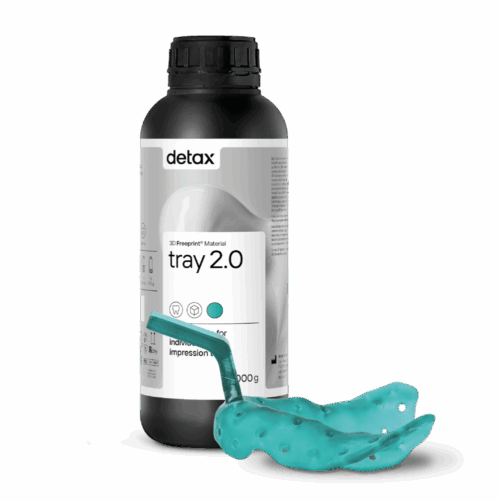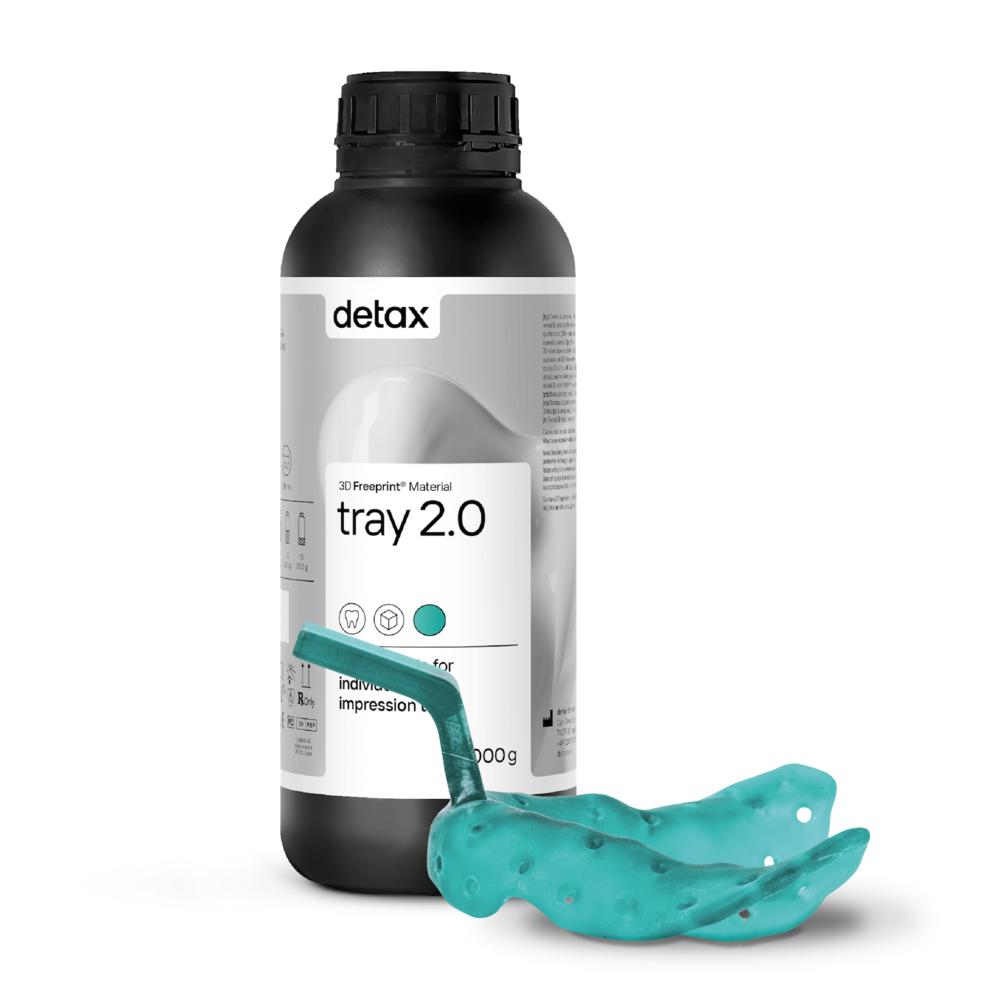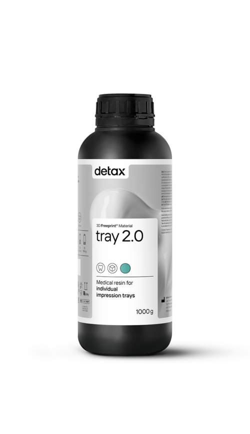 The Freeprint Tray 2.0 is the renewed tray resin from Detax for the digital production and 3D printing of functional impression trays, base plates and individual impression trays. The Freeprint Tray 2.0 has a low viscosity and therefore a lower material consumption during the entire production workflow with a faster cleaning as a result. The Freeprint Tray 2.0 offers a high dimensional stability and torsional stiffness which results in a perfect accurate and distortion-free impression.