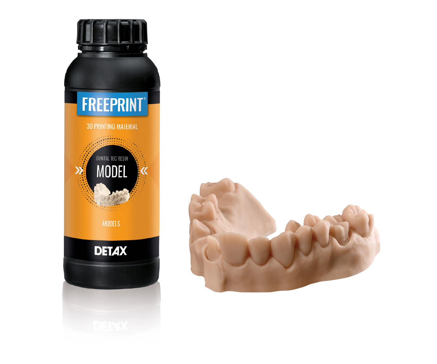 The Freeprint Model is a 3D resin for the generative manufacture of dental models. The Freeprint Model is available for all LED / UV printers with a light spectrum of 405 nm or a light spectrum of 378-388 nm such as DLP and SLA systems. The Freeprint model is very precise in details, maximum surface hardness and shape stability. With maximum precision building the model, the look & feel and stability meet the high requirements for the production of the dental models.