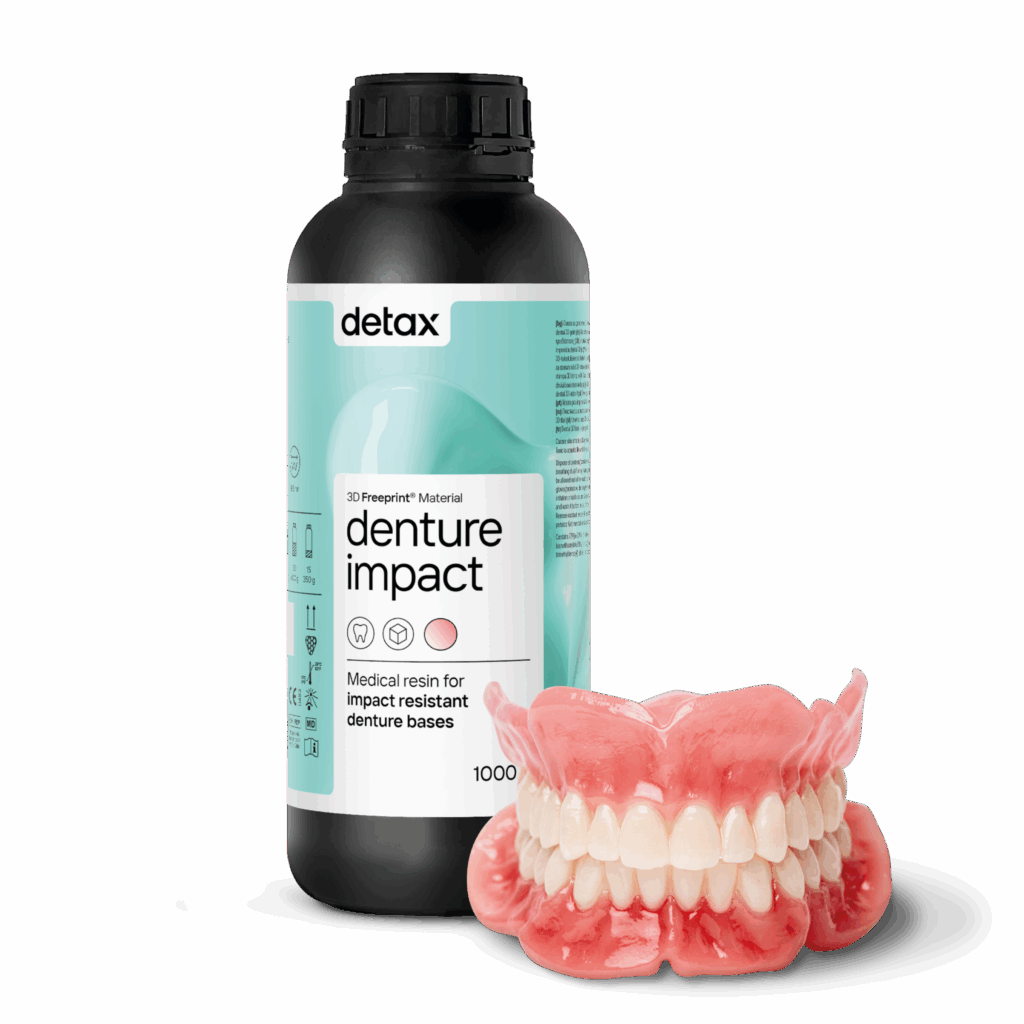 The Denture Impact from Detax is an impact-resistant premium 3D printing fluid for the digital production of the denture base and also suitable for the immediate denture. The renewed formula is according to full MDR validation and has a simpler work process compared to other suppliers. The low water absorption ensures a durable denture with longer color stability.