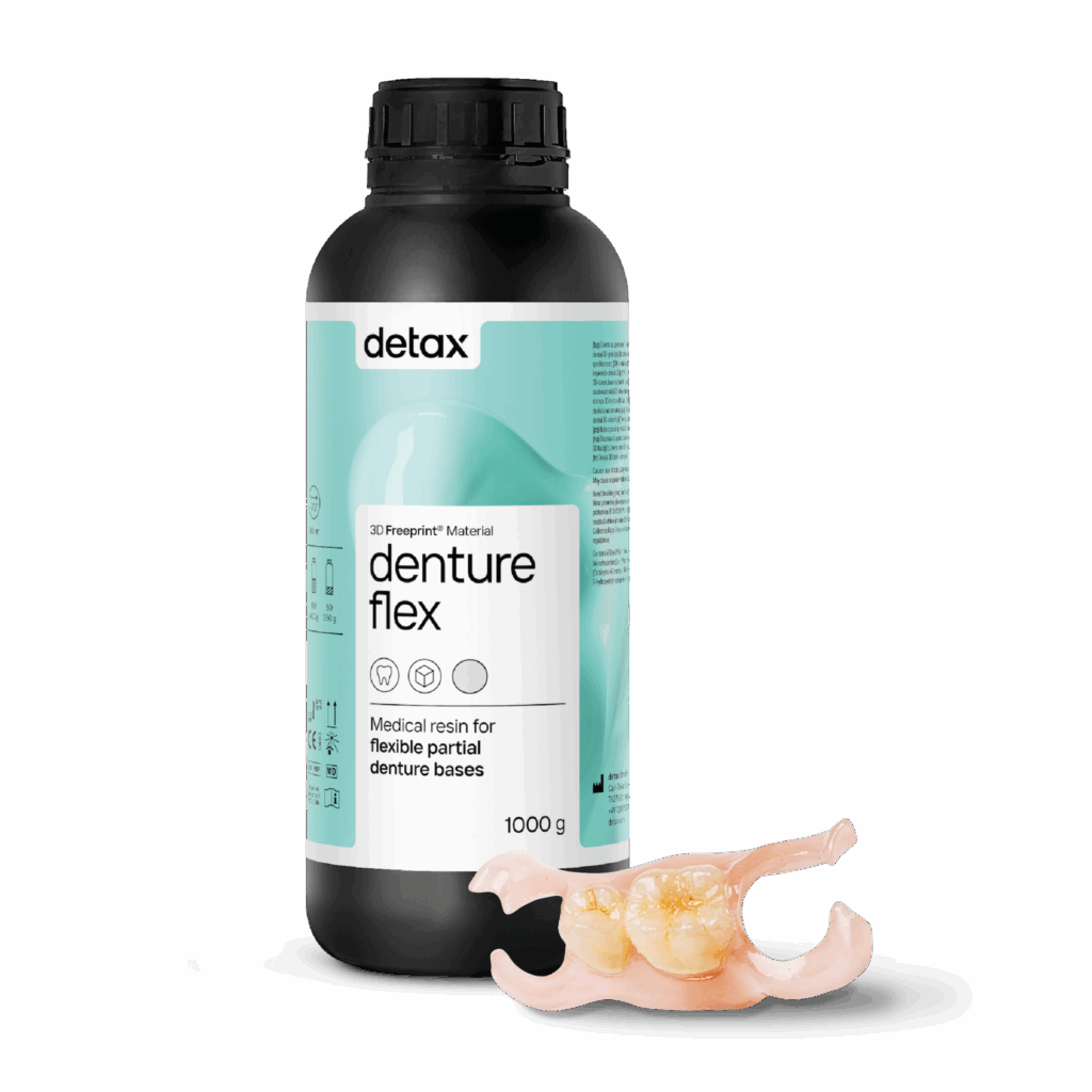 Freeprint denture flex from Detax is an innovative, MDR-certified, light-curing and biocompatible resin that has been specially developed for the 3D printing of removable partial flex dentures. This advanced material takes digital dental technology to the next level and integrates seamlessly into any modern digital workflow. This material is currently unique and is only introduced to the market by Detax.