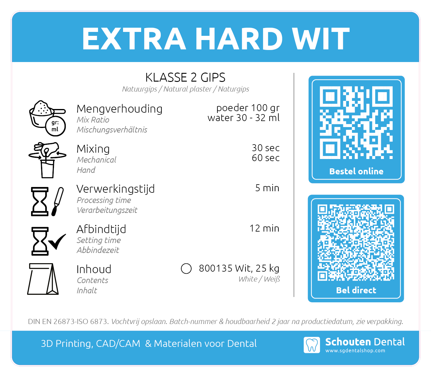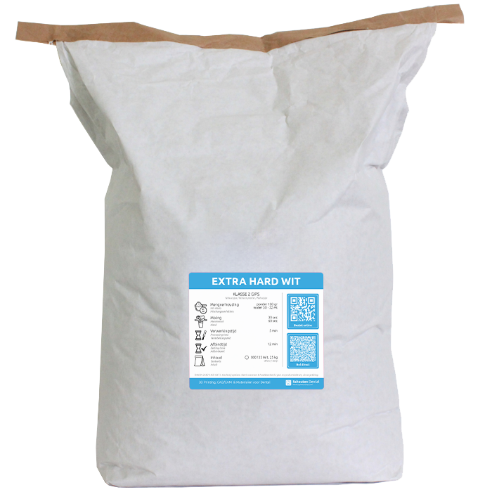 De Modelgips Extra Hard Wit is een natuurgips klasse 3 voor het inbedden van protheses. Het is een harde klasse 3 gips wat tevens gebruikt kan worden voor het maken van individuele lepels. Meng deze gips volgens de aanbevolen mengverhouding van 100 gram op 30-32 ml water zal deze gips een verwerkingstijd hebben van ca. 5 minuten met een afbindtijd van 12 minuten.